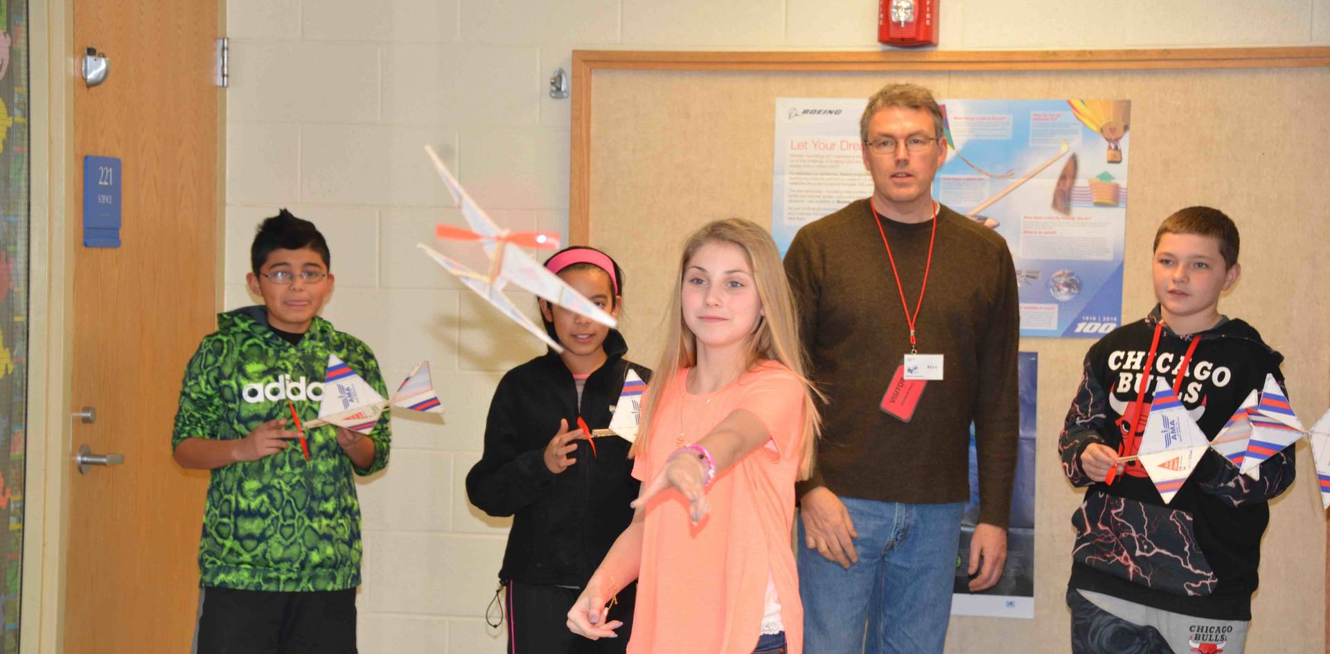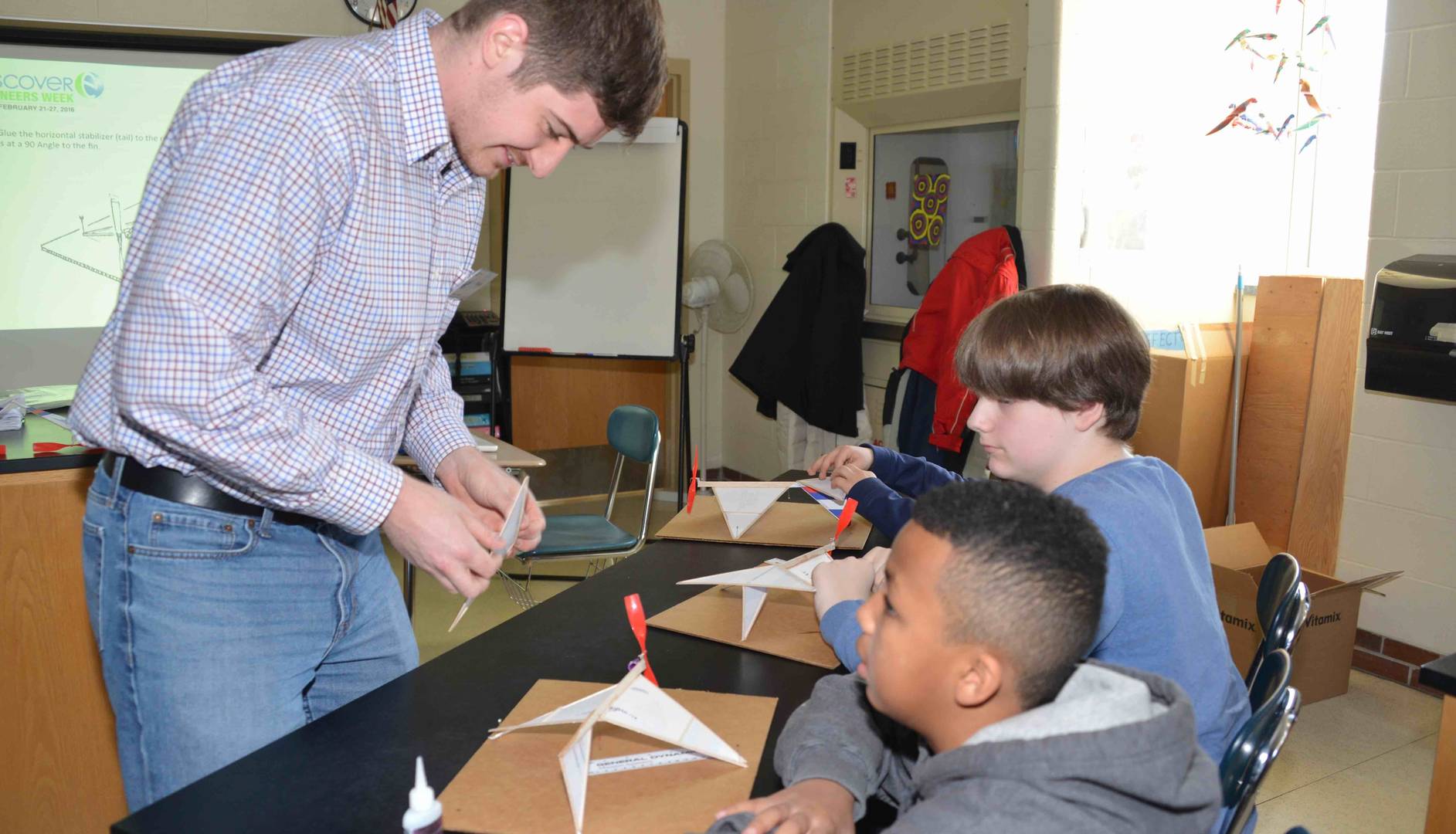 General Dynamics Engineers teach 7th grade students about elastic potential energy by building airplanes propelled by rubber bands. (Photo Credit: General Dynamics)
