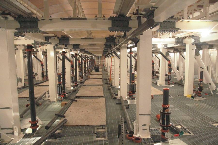 Wide aluminum columns carry coolant, and 50,000 tons of concrete make up the thick foundation and walls.